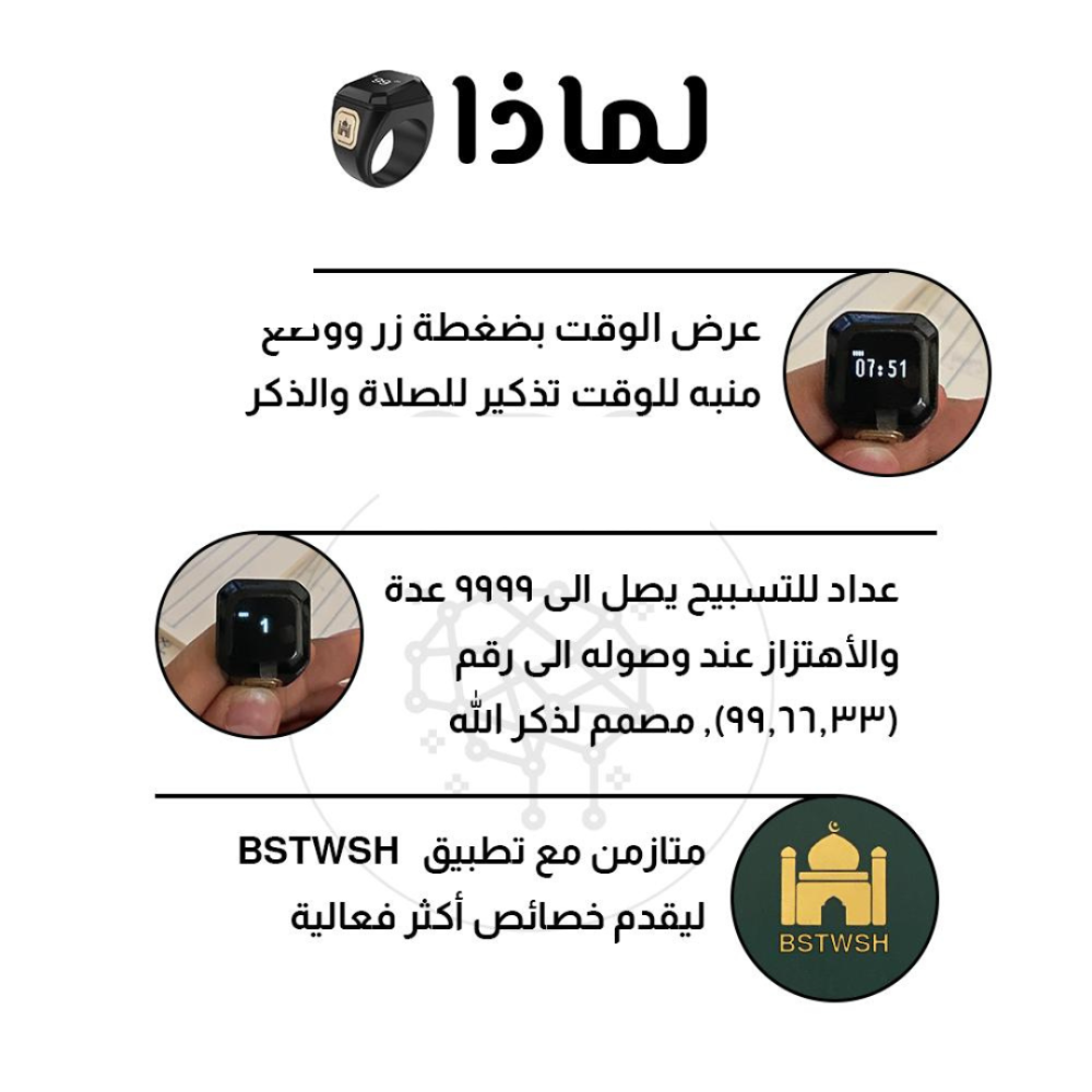 هذا الخاتم الذكي أداة خاصة وذكية تم تصميمها. ويتميز خاتم التسبيح الذكي بتصميمه العصري والحديث، مما يجعله قطعة مميزة تُعزز من شكلك الشخصي وتتناسب مع أي مناسبة.